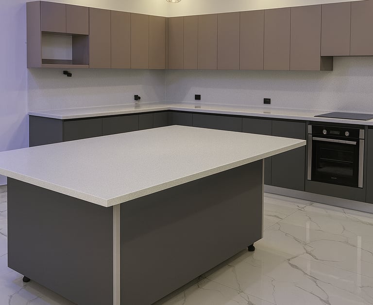 Mueblería en melamina con encimera de cuarzo Blanco Puro